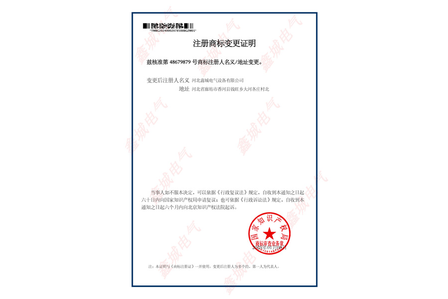 資質(zhì)榮譽(yù) 當(dāng)前位置:首頁(yè) > 資質(zhì)榮譽(yù) > 鑫城電氣 注冊(cè)商標(biāo)