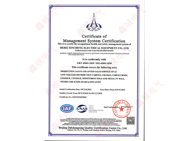 45001職業(yè)健康管理體系認證證書